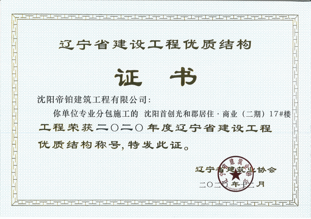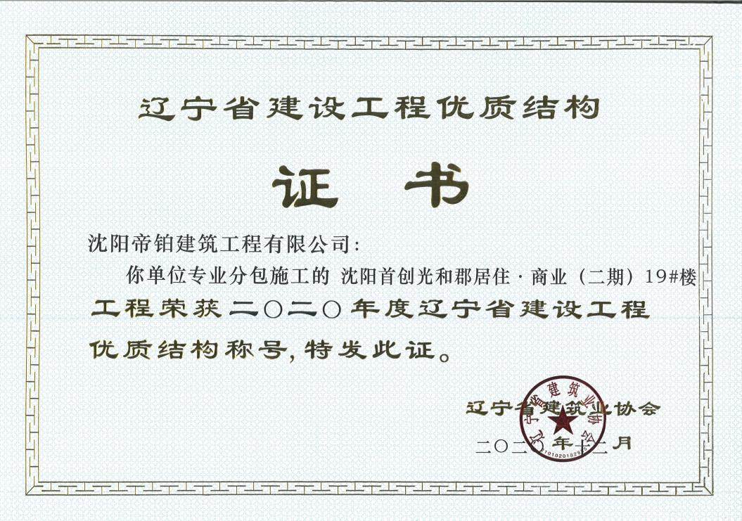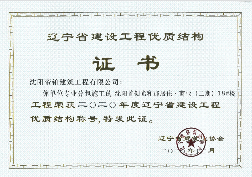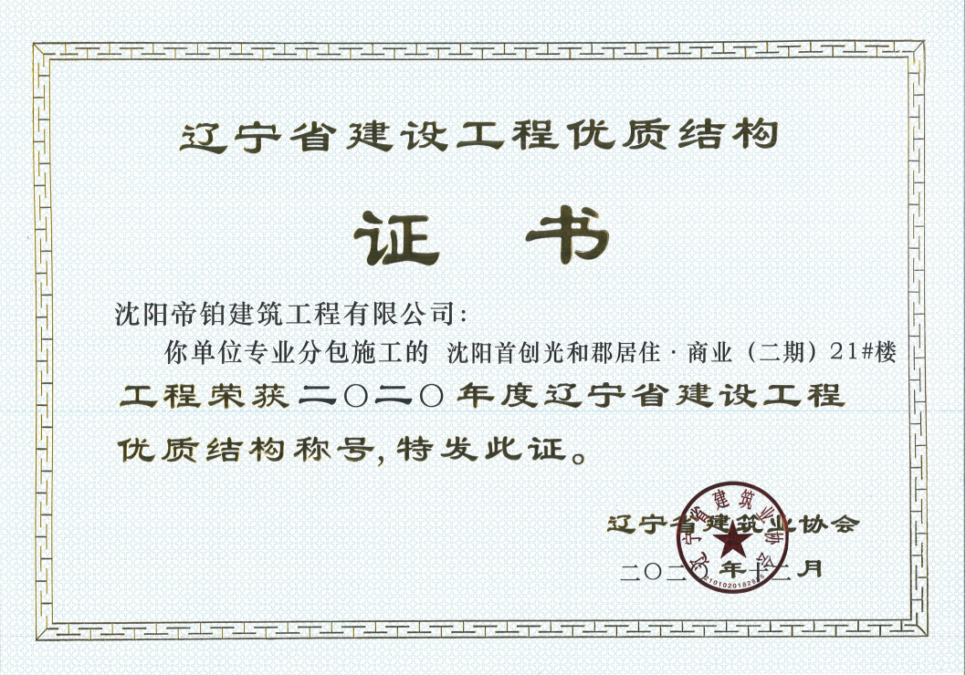 為弘揚精益求精、追求卓越的工匠精神,充分發(fā)揮榜樣引領、示范作用,遼寧省建筑業(yè)協(xié)會對建設工程進行了評選,最終由省建設工程質(zhì)量評審委員會組織認定:沈陽帝鉑建筑工程有限公司(以下簡稱帝鉑)承建的“李石河西4#地塊一期G3#樓”、“沈陽首創(chuàng)光和郡居住·商業(yè)(二期)17#”、“沈陽首創(chuàng)光和郡居住·商業(yè)(二期)18#”等9項單位工程榮獲【2020年度遼寧省建設工程優(yōu)質(zhì)結構獎】;帝鉑人員孫康、李洋、王言、楊世權、孫巖等24人獲得【2020年度遼寧省建設工程優(yōu)質(zhì)結構獎參建人員】的榮譽證書,這也是帝鉑自成立以來第二次獲此殊榮。