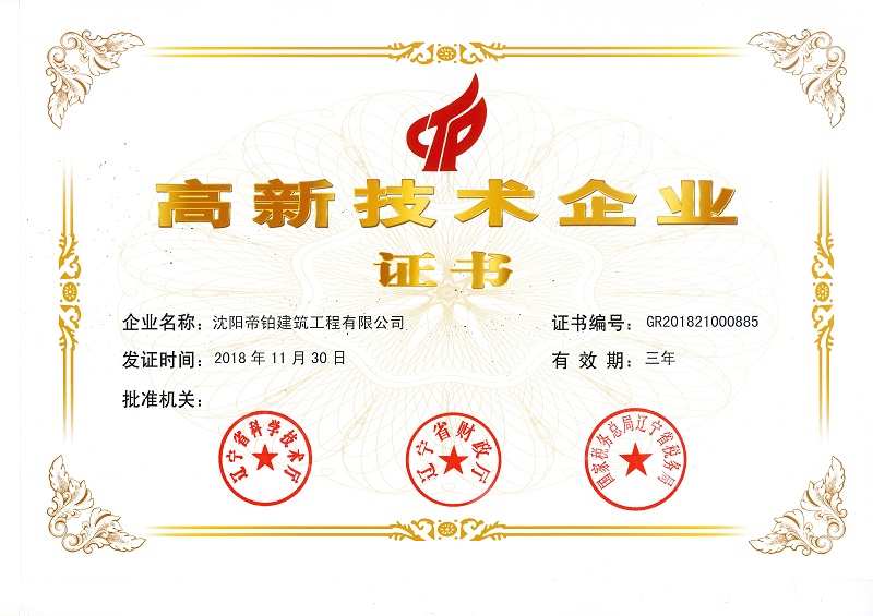 審核通過,沈陽帝鉑獲得高新技術(shù)企業(yè)榮譽(yù)稱號(hào),2019年2月遼寧省科學(xué)技術(shù)廳下發(fā)高新技術(shù)企業(yè)證書。