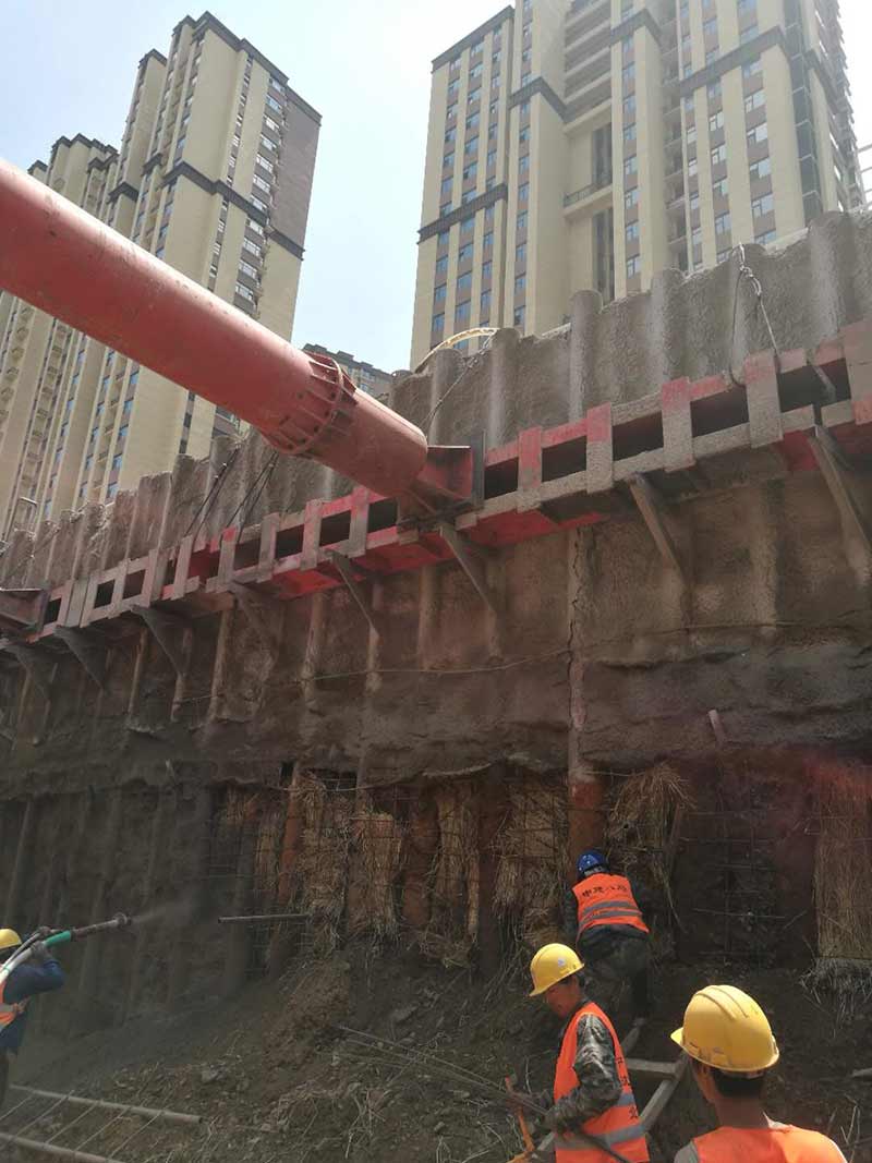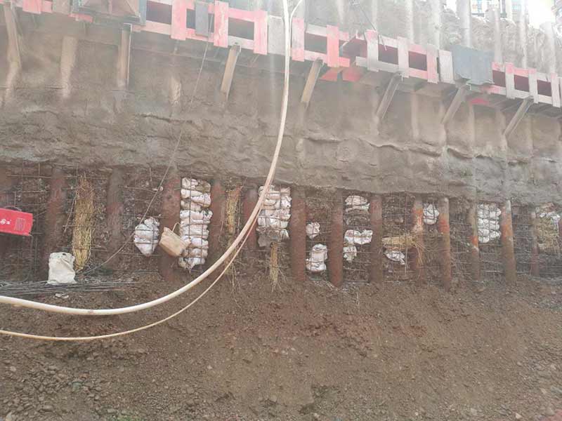 樁間噴護(hù)采用礦渣硅酸鹽水泥,標(biāo)號為P.S42.5,噴射混凝土強(qiáng)度等級為C20,噴射厚度80mm,內(nèi)置一層φ6.5@200鋼筋網(wǎng)。