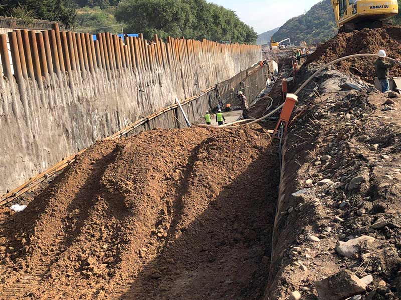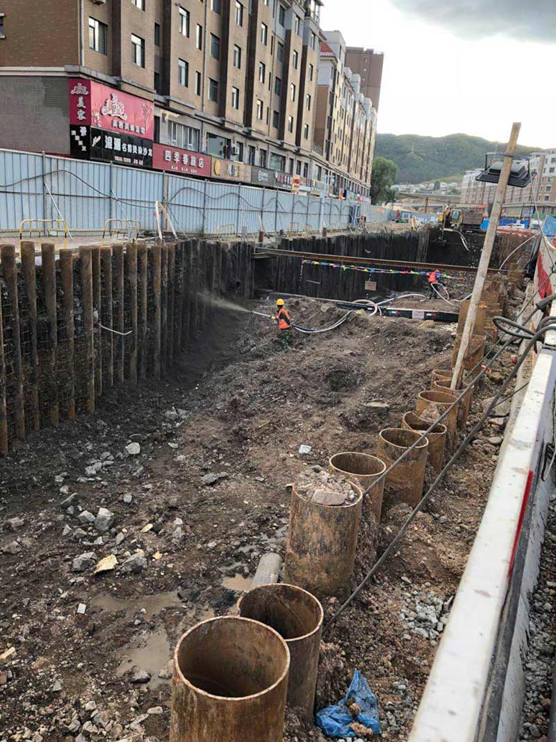 通化大街管廊K8+140-K7+710,共計(jì)430米,位于通化市與通化縣交界處,是通往通化縣唯一道路。采用φ273*7鋼管樁+錨索腰梁支護(hù)體系。