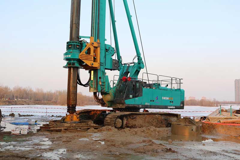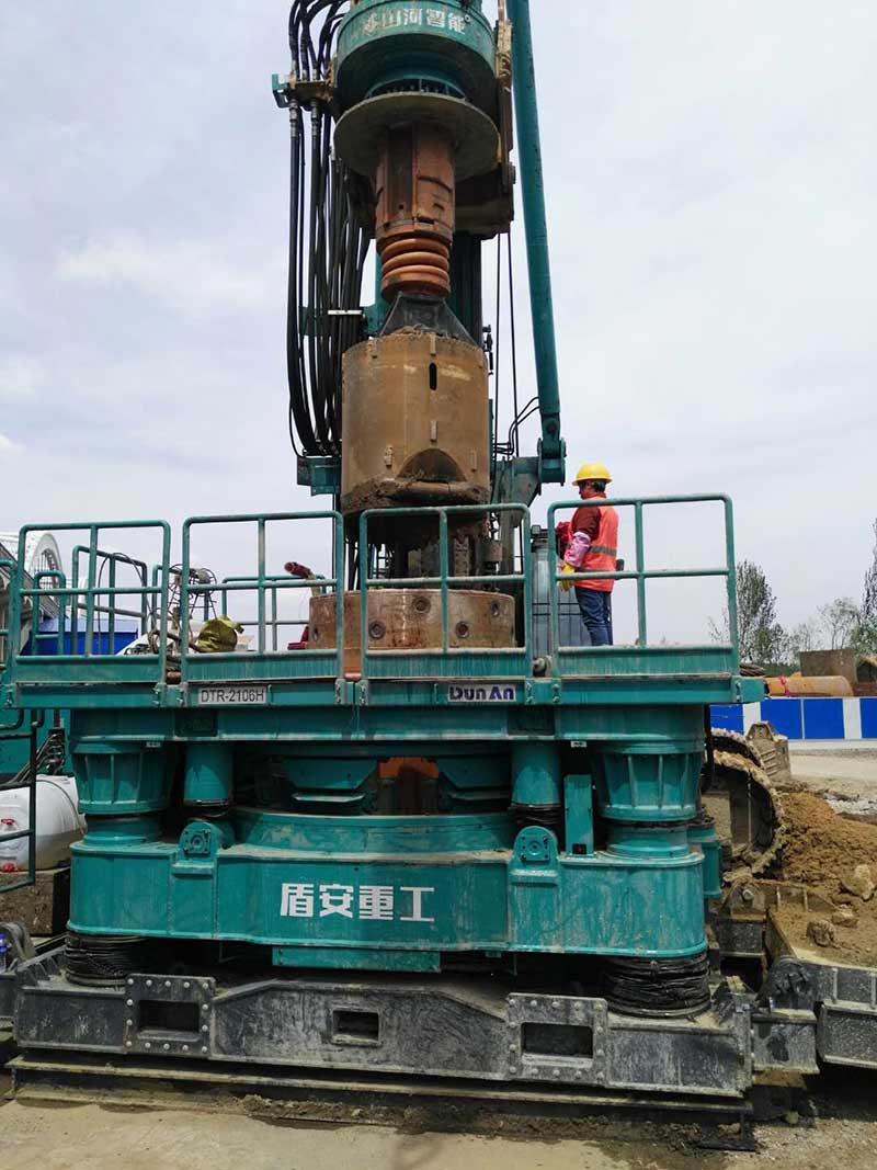 新建東側(cè)橋梁75、76承臺(tái)樁基礎(chǔ)施工前采用旋噴加固處理,旋噴樁最大深度為48米,已超過(guò)旋噴鉆機(jī)成孔極限,采用百米鉆機(jī)引孔,安放PVC塑料管,引孔完成后進(jìn)行旋噴。旋噴完成后旋挖采用擴(kuò)孔鉆頭擴(kuò)孔安放長(zhǎng)鋼護(hù)筒。